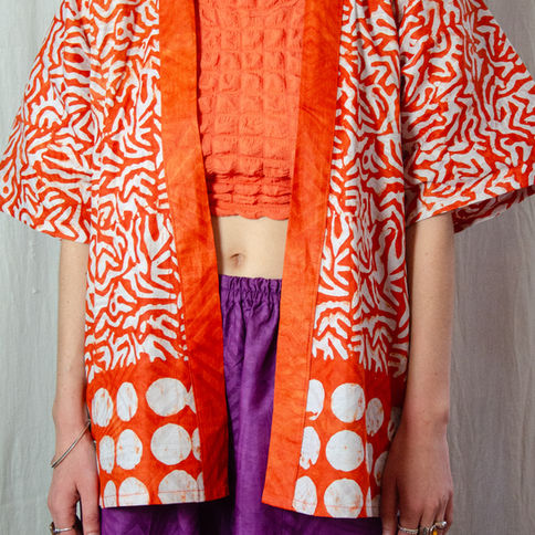 Porté ouvert, ce kimono revisité encadre le buste et apporte immédiatement du relief à une tenue simple. Sa coupe ample et ses manches au coude créent un volume maîtrisé, tandis que la bordure contrastante souligne les lignes avec précision.