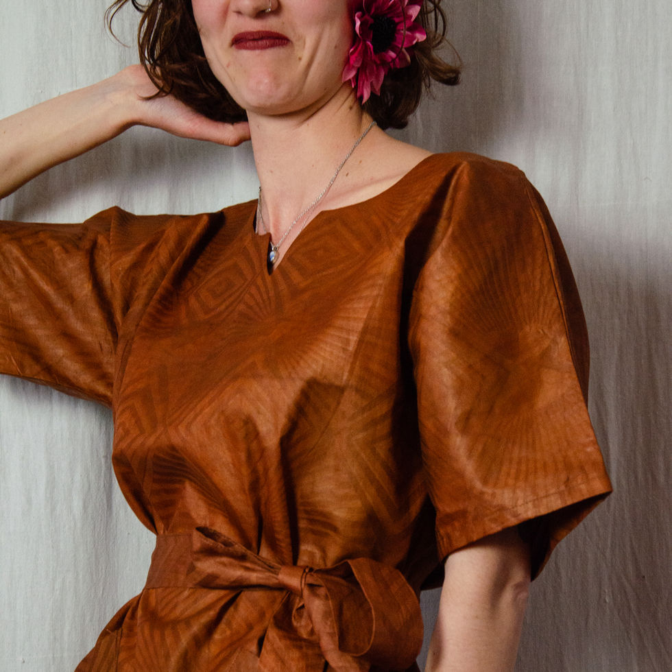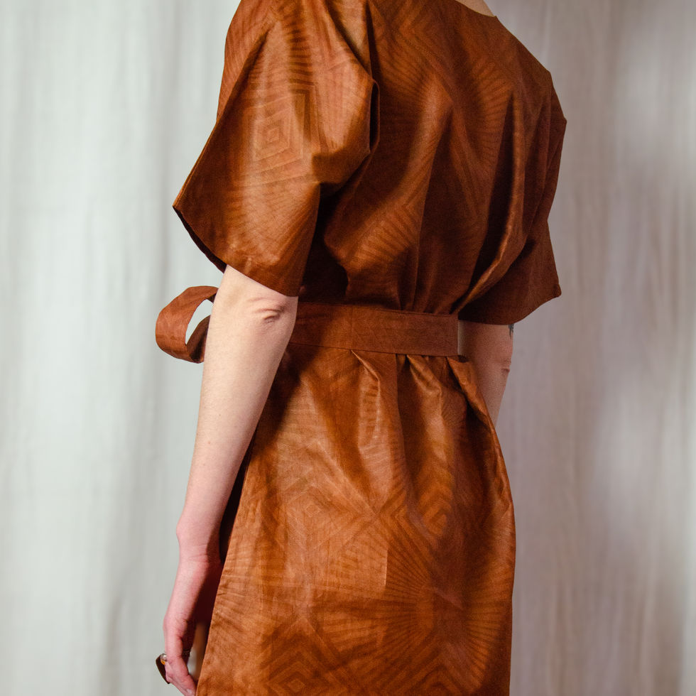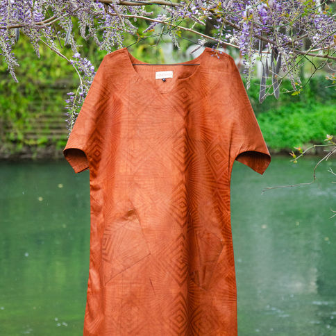 Déclinée dans un bazin uni teint à la main en Guinée, chaque pièce est unique. Portée libre, la robe conserve toute son ampleur.