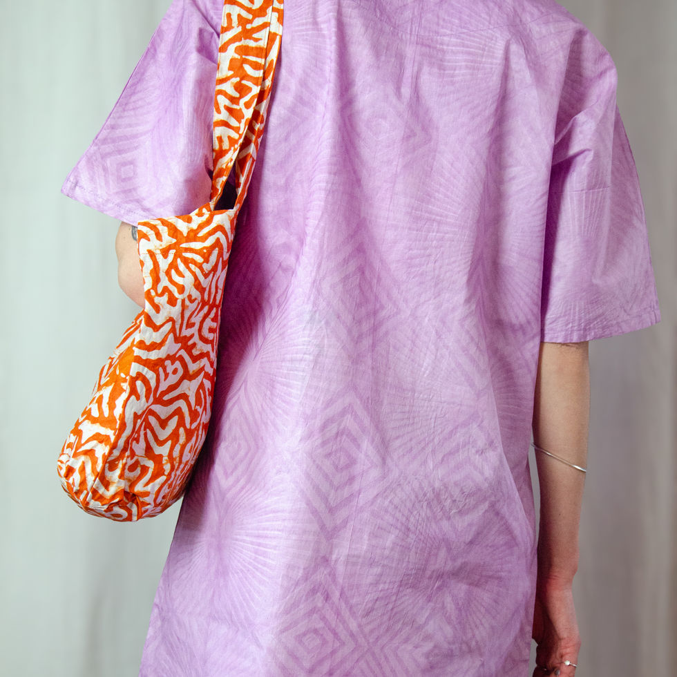 Déclinée dans un bazin uni teint à la main en Guinée, chaque pièce est unique. Portée libre, la robe conserve toute son ampleur.