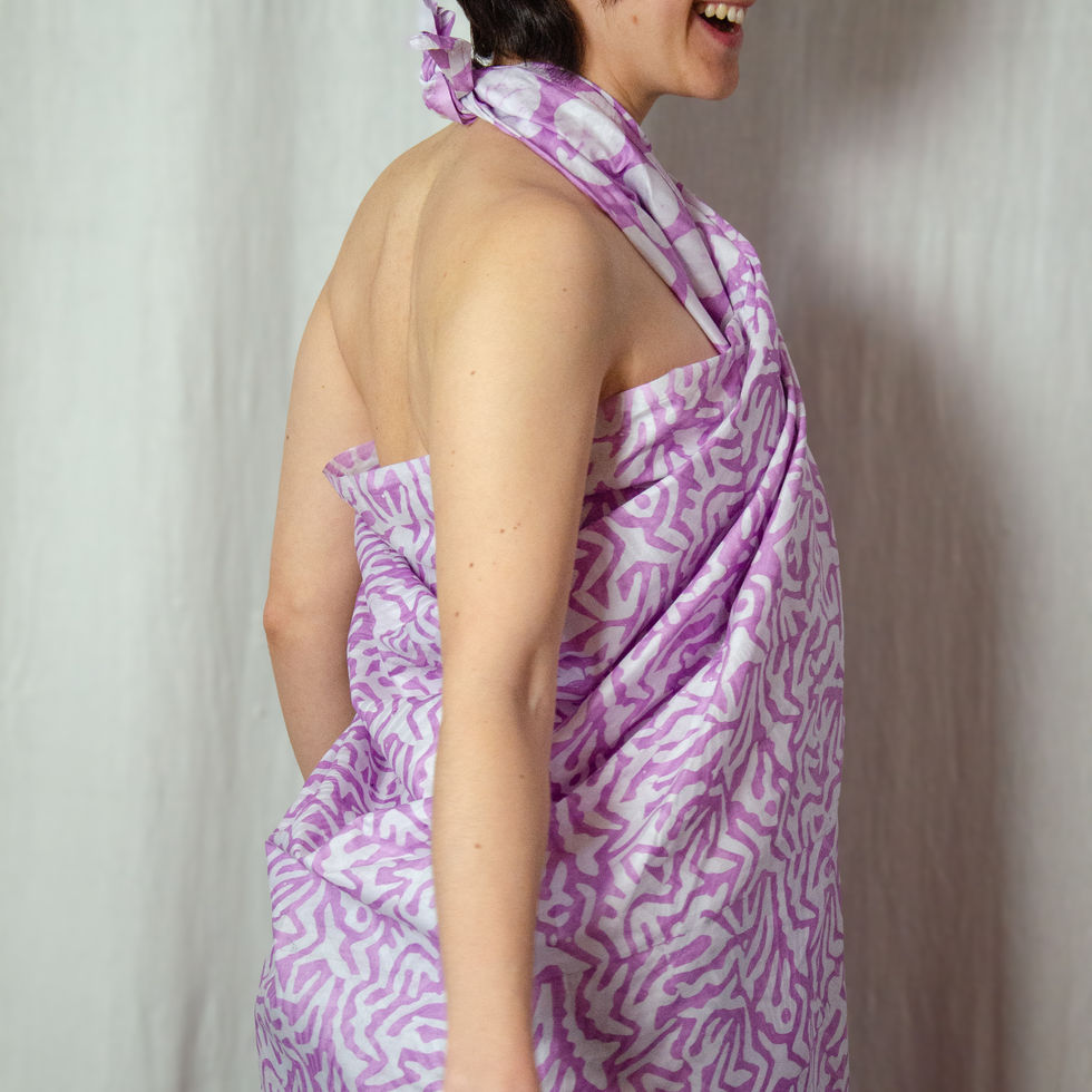 Ce pagne en bazin accompagne les silhouettes avec une élégance naturelle. Sa tenue unique lui permet de se structurer autour du corps, créant des lignes franches tout en restant fluide dans le mouvement. Il se porte librement, comme un paréo — noué, drapé, superposé — et se transforme au fil des heures.