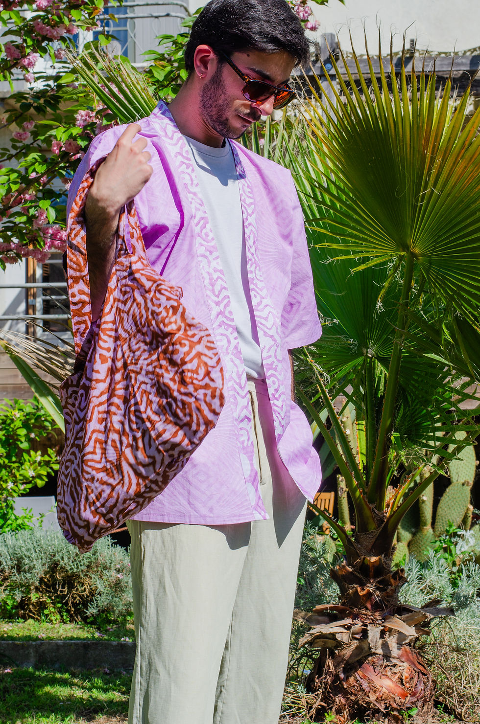 Confectionné dans un coton damassé teint à la main en Guinée, il reprend les codes du vestiaire Odia et prolonge naturellement les silhouettes de la collection. Porté à l’épaule, il accompagne aussi bien les escapades en bord de mer que les journées en ville.
